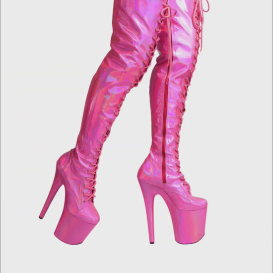 Pearlescent Pink Thigh 8 Inch Platform Boots.